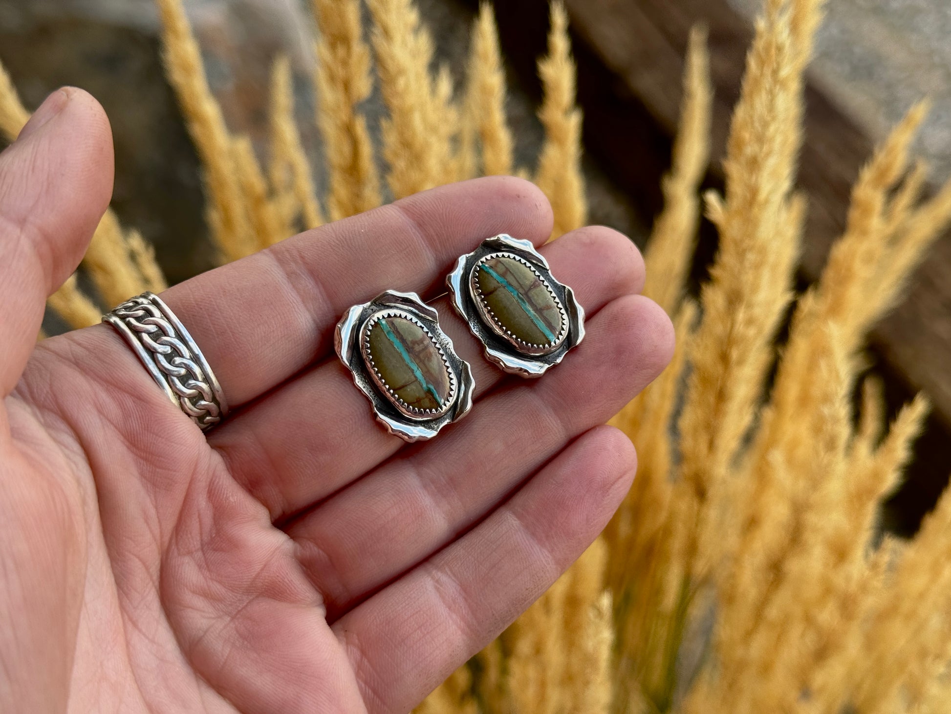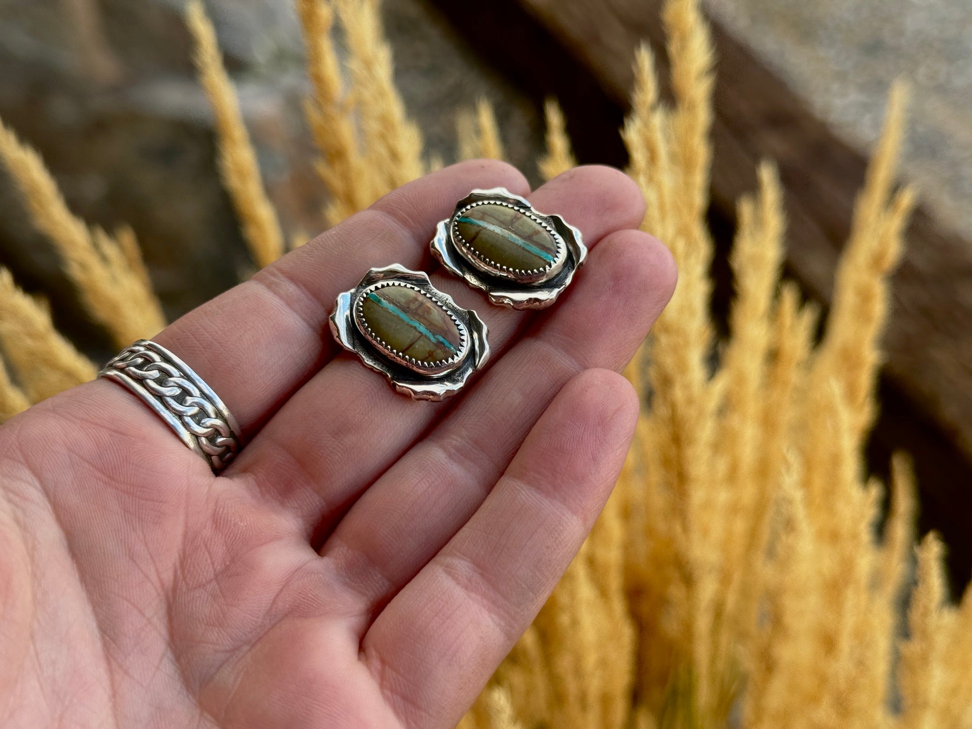 These .925 sterling silver studs are set with Royston Ribbon turquoise and handcrafted by Alexandra Rose in Southwestern Montana. Each pair is unique, so you’re getting something truly special!!