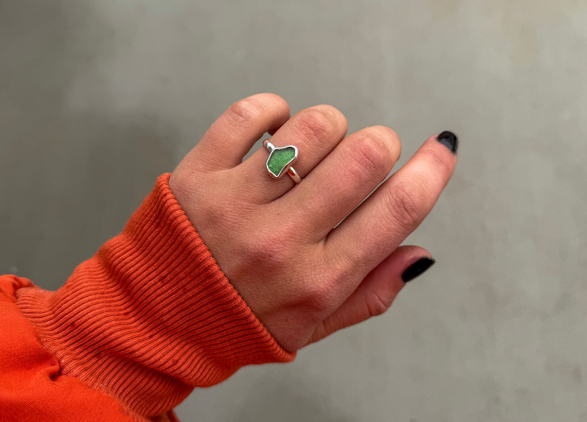 Featuring genuine Michigan seaglass, this ring fits true to size with a 10G band. Simple, sweet, and carrying a touch of the lake wherever you go!