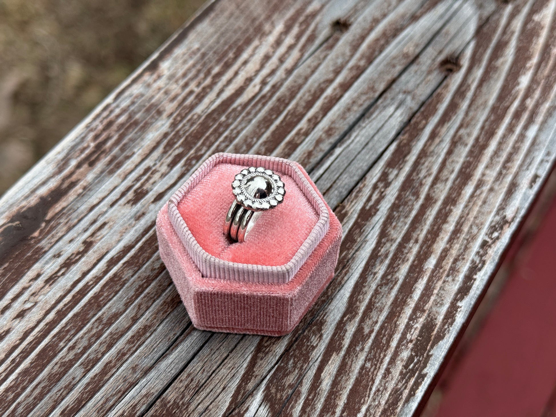 A classic concho design set on a triple sterling silver band. The layered band adds dimension while keeping the ring simple, strong, and timeless.